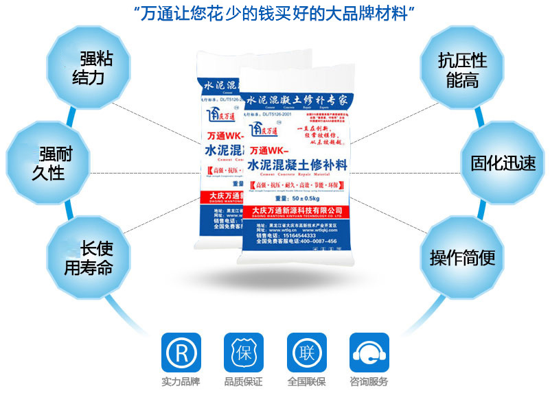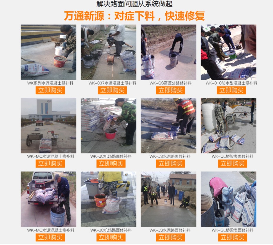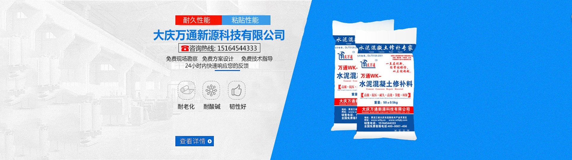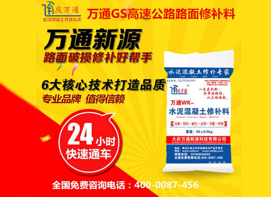 大慶萬通新源科技有限公司獨有的混凝土路面高強速補料,是水泥混凝土路面病害修復的好材料。疲勞、凍融循環(huán)、彎曲壓力、滲水和基層破壞等原因都會引起水泥路面的破損,從而帶來高昂的維護費用。與以往的剛性修補方法不同,混凝土水泥路面維修速補膠提供了一種獨特的柔性修補產(chǎn)品和技術,高柔性、高抗拉性,可跨伸縮縫施工和高抗壓性使得混凝土快補產(chǎn)品為水泥混凝土路面提供了******性的修補。傳統(tǒng)的剛性修補方案,如環(huán)氧砂漿和快干水泥產(chǎn)品,由于其自身的粘結失效,抗疲勞性低以及與原路面不同的伸縮系數(shù),修補面會在短時間內(nèi)失效或產(chǎn)生新的裂縫,需要反復修補,有效期短且費用高昂。大慶萬通新源科技有限公司的混凝土水泥路面維修速補膠可以隨原路面一起伸縮,移動,從而避免了粘結失效和產(chǎn)生新裂縫。萬通快補產(chǎn)品優(yōu)異的粘結性、柔韌性和高防滑性,特別適用于水泥路面的淺層粘合修補,多邊角混凝土板層修補,跨伸縮縫修補以及路面沉陷修補。萬通混凝土病害修補料針對混凝土起皮起沙、斷板裂縫、蜂窩麻面、坑槽露石子、漏筋掉皮、橋梁的掉皮漏筋快速通車使用時間長。應用萬通快補產(chǎn)品,施工后一天就可以恢復交通。大慶萬通新源科技有限公司的萬通水泥路面維修速補膠適用于高速公路、機場路面、農(nóng)村村村通路面、廠坪、學校操場、市區(qū)公路、小區(qū)路面、橋梁、水泥路面的修補。使用萬通特快補材料修補路面可以一勞永逸! 水泥地面起砂怎么辦,混凝土修補劑混凝土地面起砂,混凝土地面修補,地面起砂怎么辦,